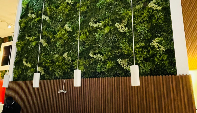 Wooden slat finishes and suspended lighting elements were carefully coordinated with the greenery to maintain a balanced, contemporary aesthetic. The artificial plants were selected for durability and realism, ensuring a lush appearance with no watering, no sunlight, and minimal maintenance, making it ideal for high-traffic corporate environments.