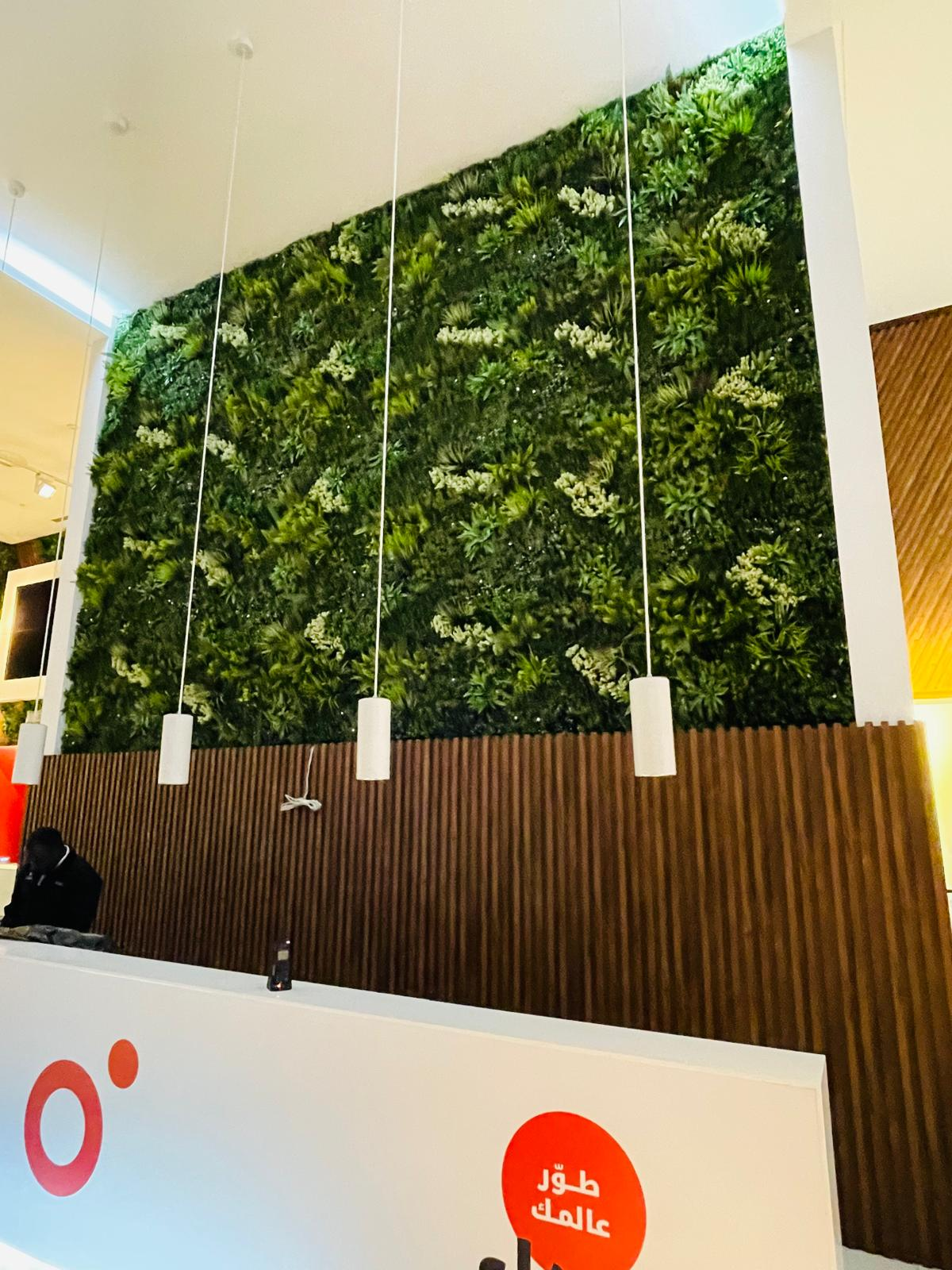 The project features a dense composition of premium artificial foliage, combining varied leaf textures and tonal greens to create a rich, natural-looking vertical garden. Installed across double-height wall sections and integrated around architectural elements and digital display areas, the green wall adds depth, scale, and visual continuity throughout the space.