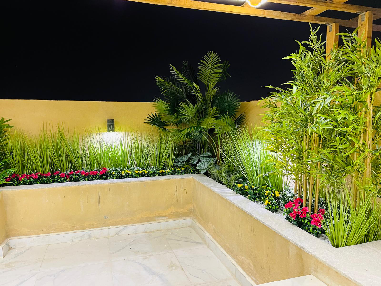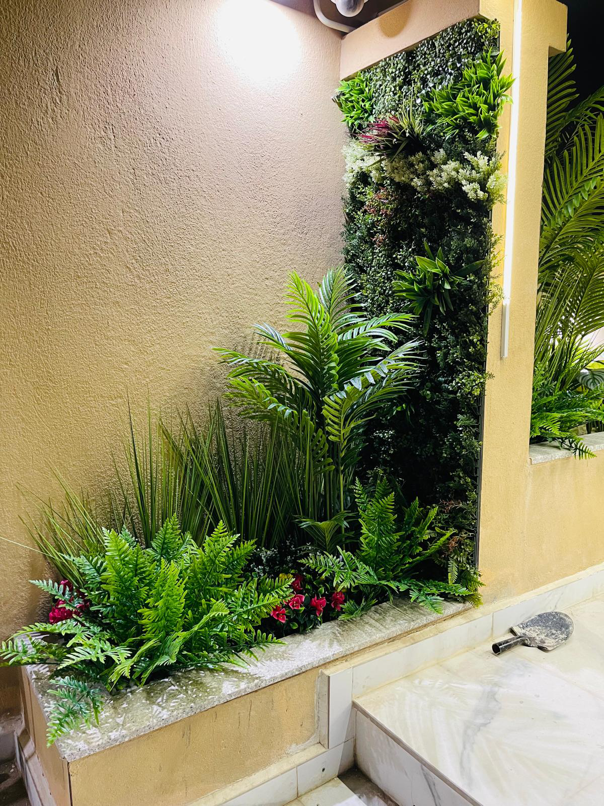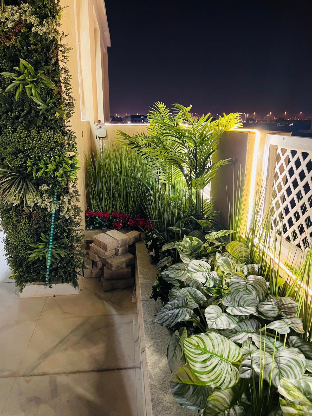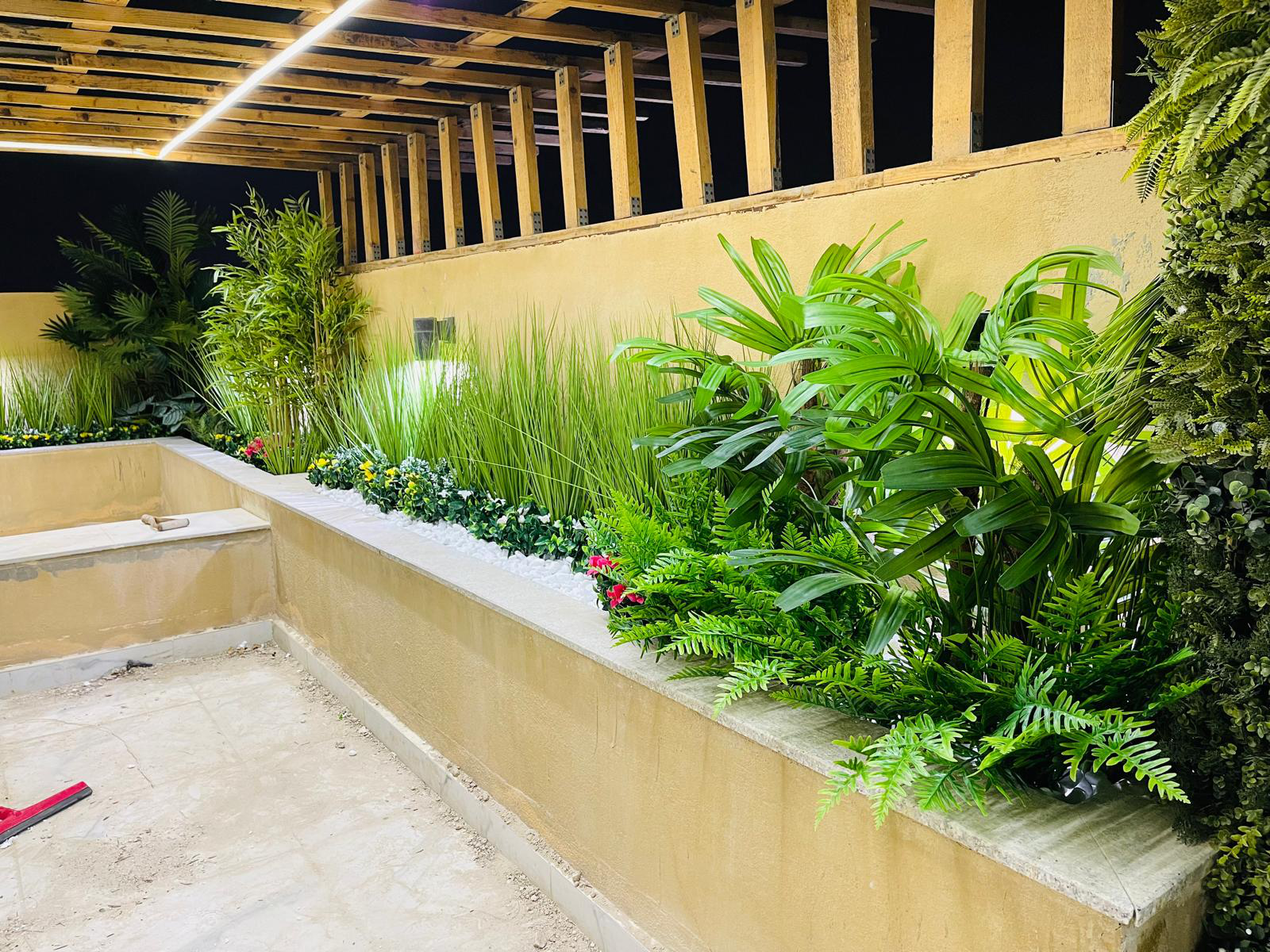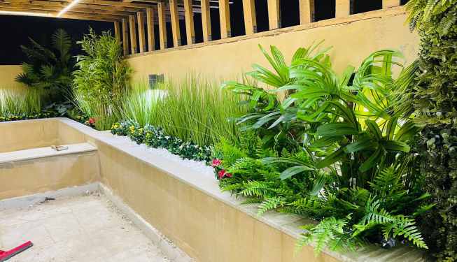 The project features a carefully layered mix of premium artificial plants, including ornamental grasses, tropical foliage, flowering accents, and structured green wall elements. The greenery was integrated into raised planters and vertical surfaces to add depth, privacy, and a natural flow throughout the villa’s terrace and outdoor walkways.