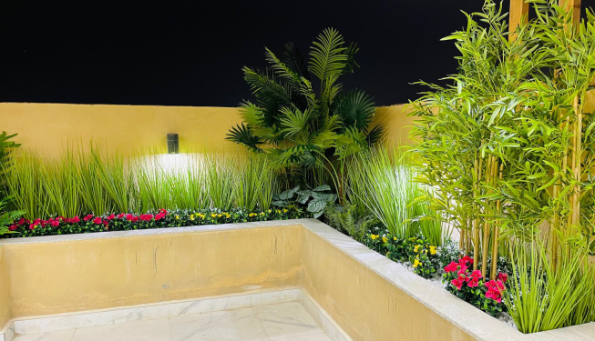 Warm architectural lighting was incorporated to highlight the textures and colors of the foliage at night, creating a calm, resort-style ambiance ideal for outdoor seating and entertaining. All materials were selected for durability and color stability, ensuring the installation remains vibrant despite Qatar’s climate.